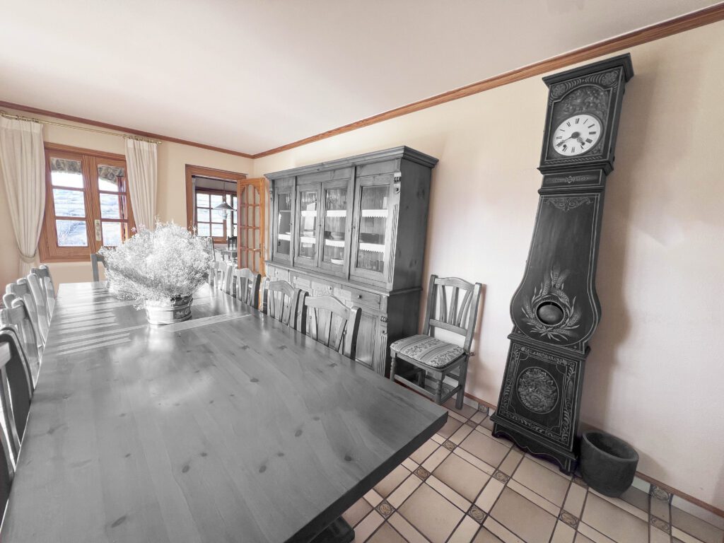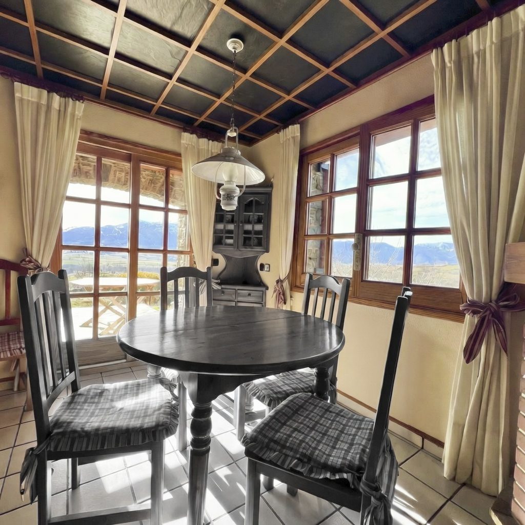 Junto a la cocina, la gran sala comedor con capacidad para hasta 14 comensales, con acceso directo al jardín exterior desde los grandes ventanales que permiten gozar de las exclusivas vistas de todo el valle.